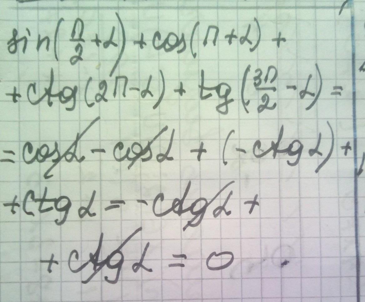 9). Спростити вираз: sin ( п/2 + a) + cos ( п + a) + ctg ( 2п - a) + tg ( 3п/2 · a)=​