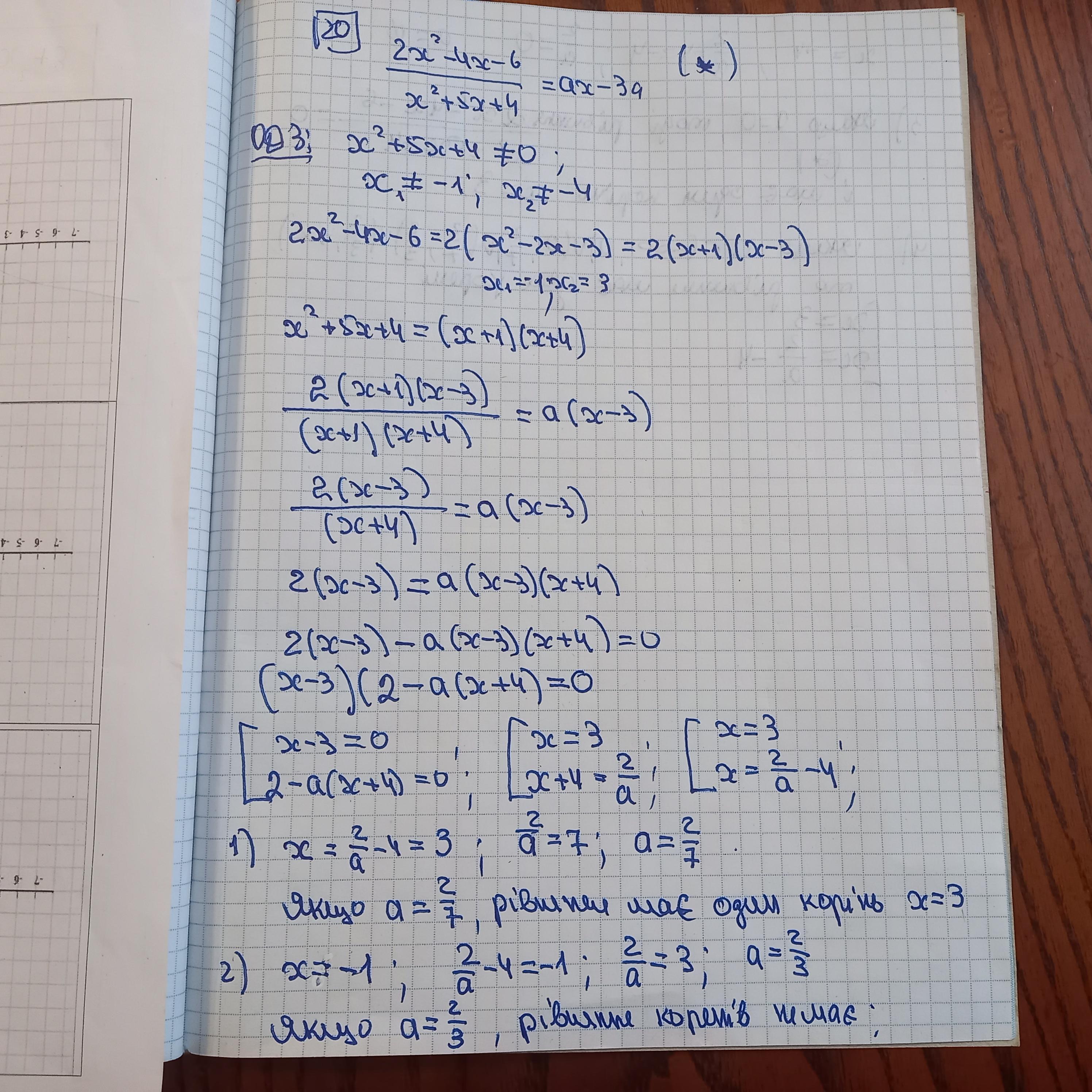 Розв’яжіть рівняння 2x^2−4x−6/x^2+5x+4 = ax−3a залежно від значень параметра а.
