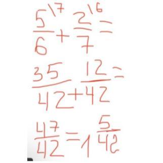 ищем наименьший спільний знаменник , це буде 42 ( потрібно знайти таке число яке будет ділитися і на 6 , і на 7) тому мі просто перемножаемо їх разом , виходить 42. але не завжди це может бути НАЙМЕНЬШИЙ спільний знаменник