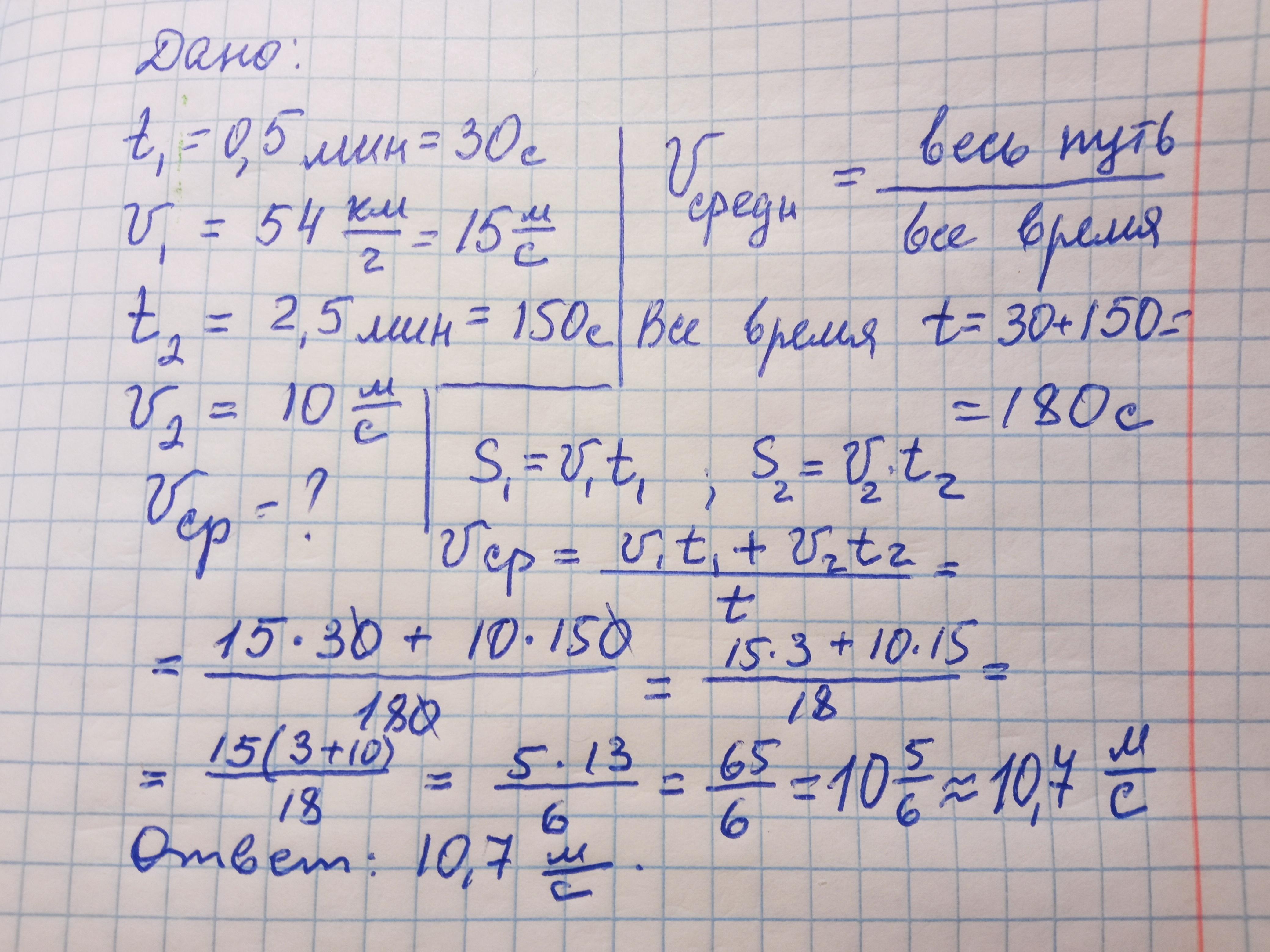 Автомобіль перші 0,5 хв рухався зі швидкістю 54 км/год, а наступні 2,5 хв зі швидкістю 10 м/с. Чому дорівнює середня швидкість руху автомобіля?