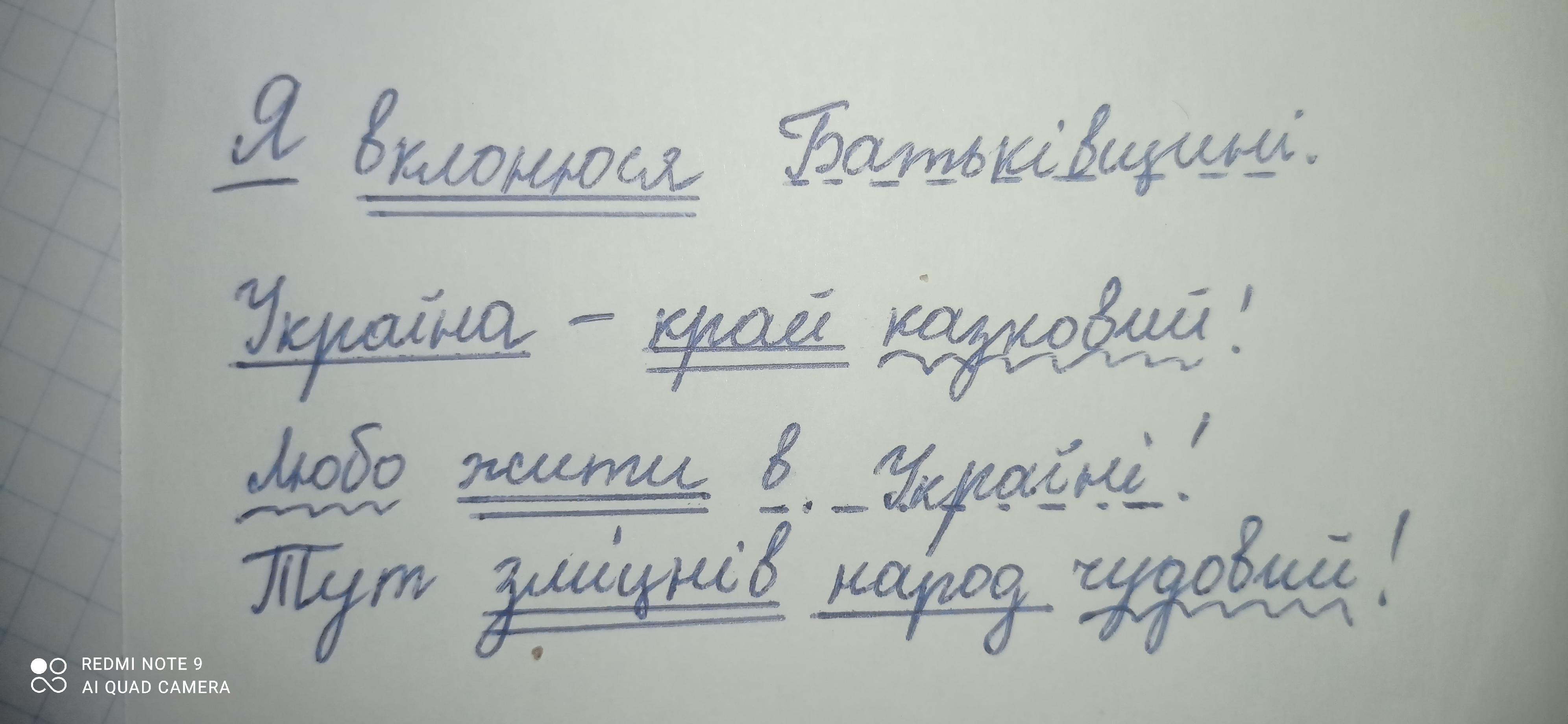 Завдання: переписати, підкреслити члени речення: Я вклонюся Батьківщині! Україна - край казковий! Любо жити в Україні! Тут зміцнів народ чудовий!