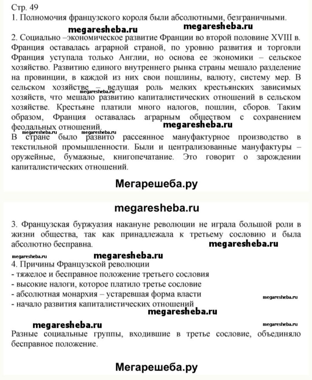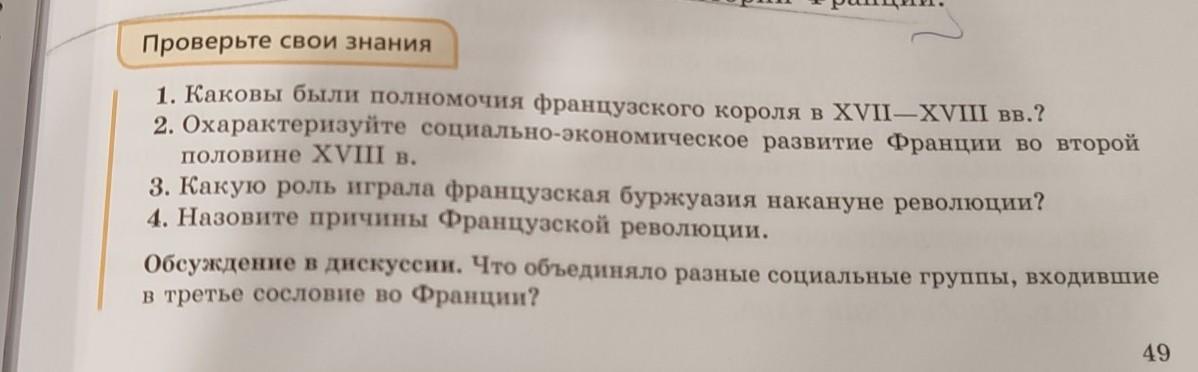 1. Каковы были полномочия французского короля в XVII—XVIII вв.? развитие Франции во второй 2. Охарактеризуйте социально-экономическое половине XVIII в. 3. Какую роль играла французская буржуазия накануне революции? 4. Назовите причины Французской революции. Обсуждение в дискуссии. Что объединяло разные социальные группы, входившие в третье сословие во Франции, 49