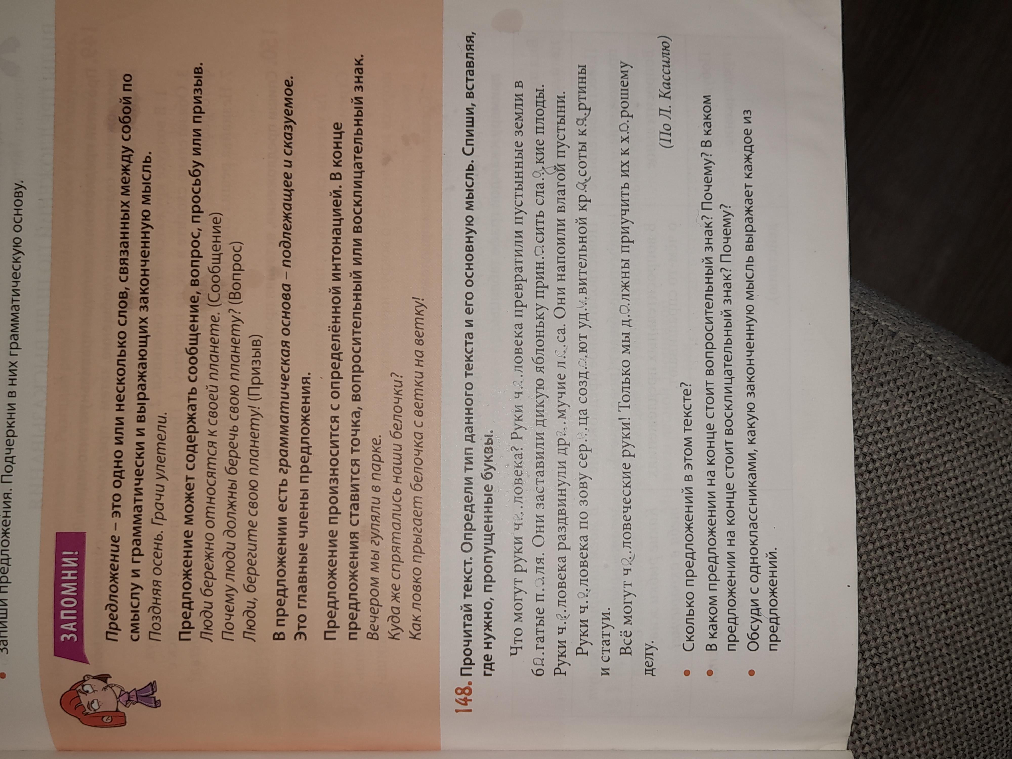 Прочитай текст.Определи тип данного текста и его основную мысль.Спиши вставляя,где нужно,пропущенные буквы. Сколько предложений в этом тексте. Упражнение 148