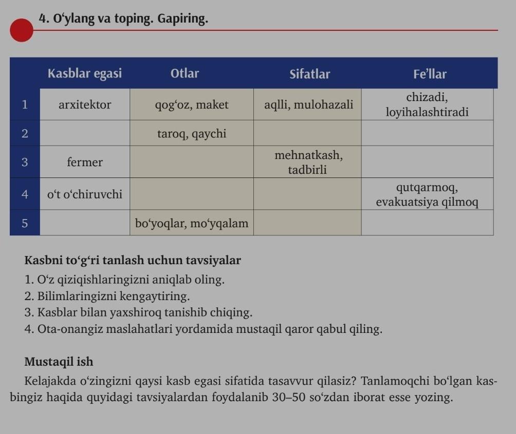 4)o't o'chiruvchi-otlar:suv, narvon; sifatlar:diqqatli,o'ziga ishongan