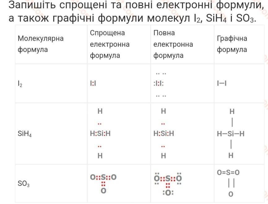 Запишіть спрощені та повні електронні формули, а також графічні формули молекул I2, SiH4, SO3.