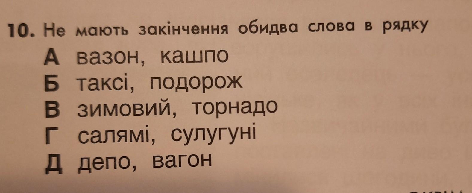 10. Не мають закiнчення обидва слова в рядку А вазон, кашпо Б таксi, подорож в зимовий, торнадо Г салямі, сулугуні Д Депо, вагон