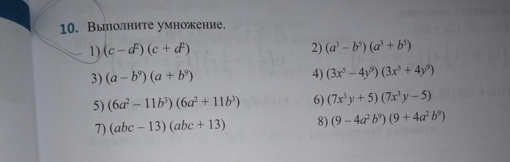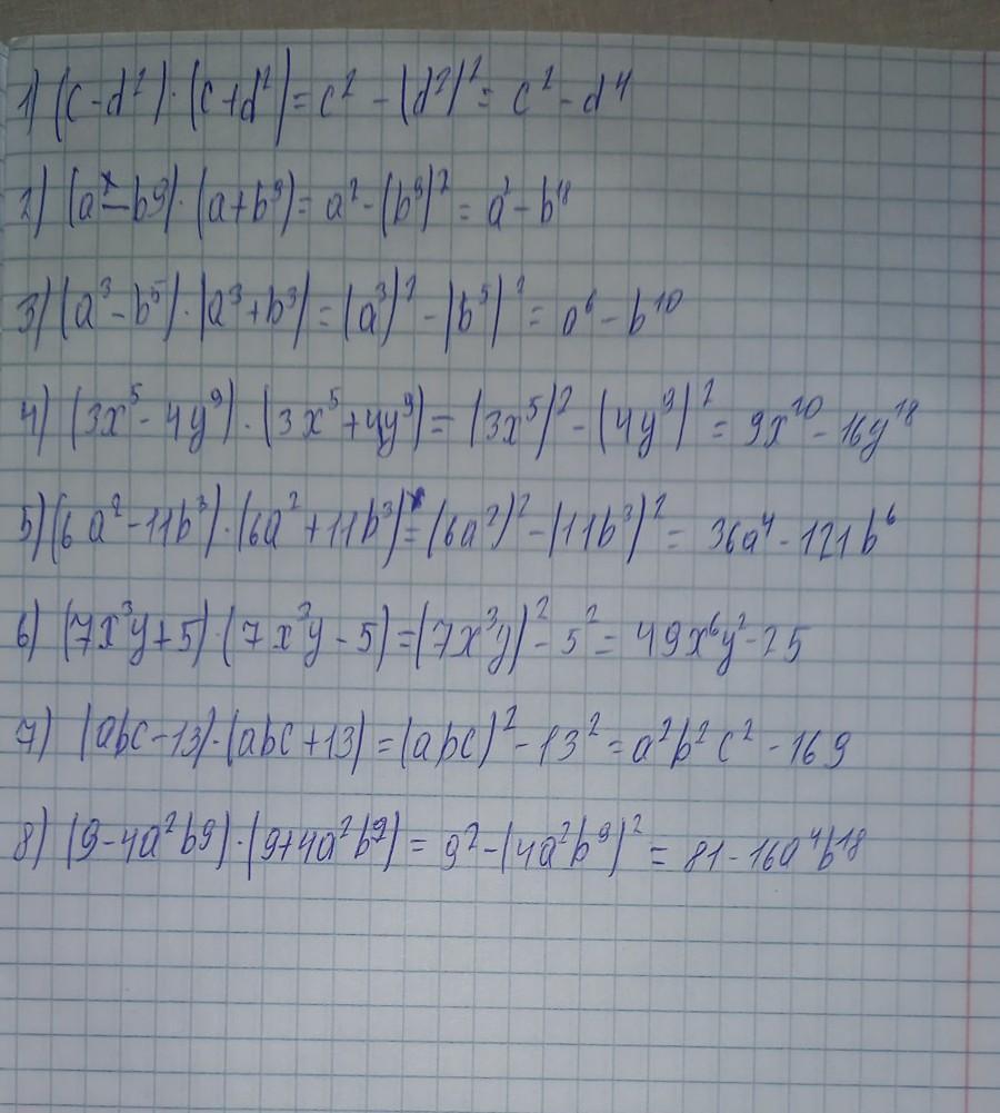Ответ:1)с²-d⁴ 2)a⁶-b¹⁰ 3)a²-b¹⁸ 4)9x¹⁰-16y¹⁸ 5)36a⁴-121b⁶ 6)49x⁶y²-25 7)a²b²c²-169 8)81-16a⁴b¹