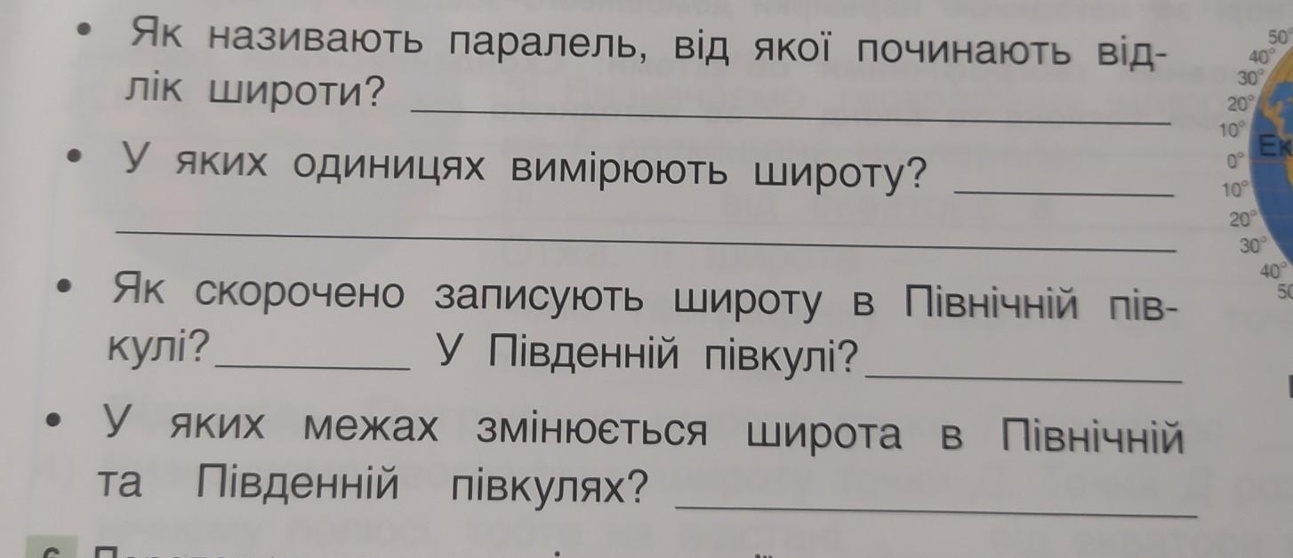 3.Точки, розміщені на північ від екватора, у Північній півкулі, мають північну широту (пн. ш.). А ті, що розміщені на південь від екватора, у Південній півкулі, – південну широту (пд. ш.).