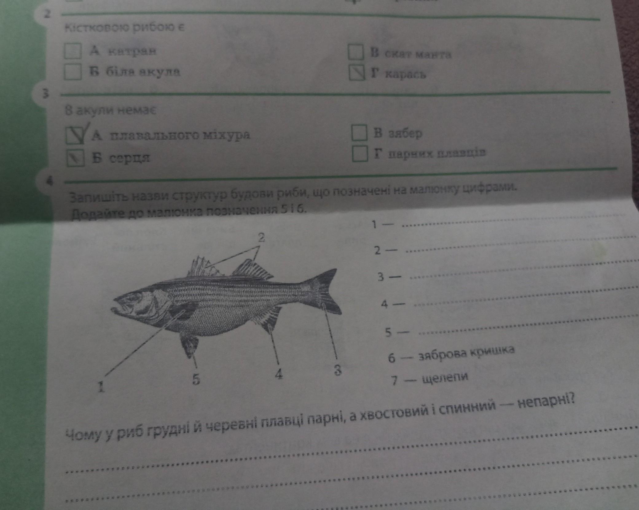 Відповідь 2. Г) 4. 1 - Бічний плавець 2 - Спинні плавці 3 - Хвіст 4 - Анальний плавець 5 - Черевний плавець