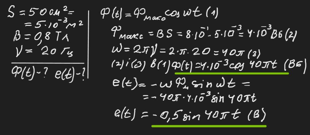 Проволочная рамка площадью 50см2 вращается с частотой 20 Гц в магнитном поле индукцией 0,8 Тл. в начальный момент времени нормаль к плоскости рамки совпадала с направлением магнитного поля. Найдите формулы выражающие зависимости магнитного потока и ЭДС от времени.