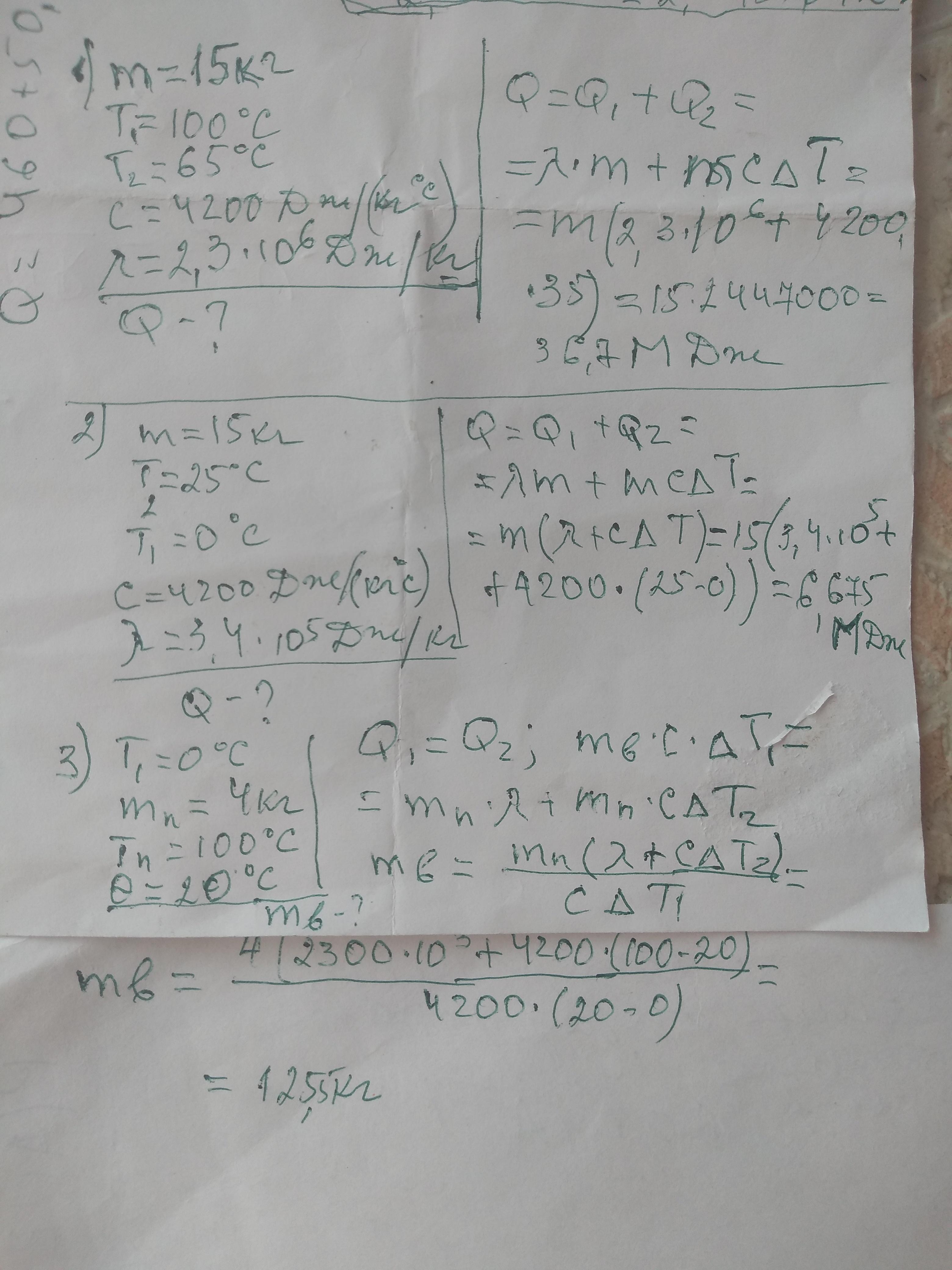 1)Какая энергия выделится при конденсации водяного пара массой 15 кг и температурой 100 оС при охлаждении получившейся из него воды до температуры 65 оС? (Удельная теплоемкость воды равна 4200Дж/кг * °С, удельная теплота парообразования 2,3*106 (Дж/кг)