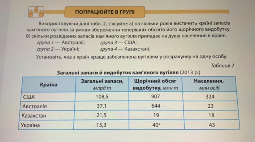 Використовуючи данi табл. 2, з'ясуйте: а) на скільки років вистачить краïнi запасів кам'яного вугілля за умови збереження теперішніх обсягів його щорічного видобутку; б) скільки розвіданих запасів кам'яного вугілля припадає на душу населення в країні: