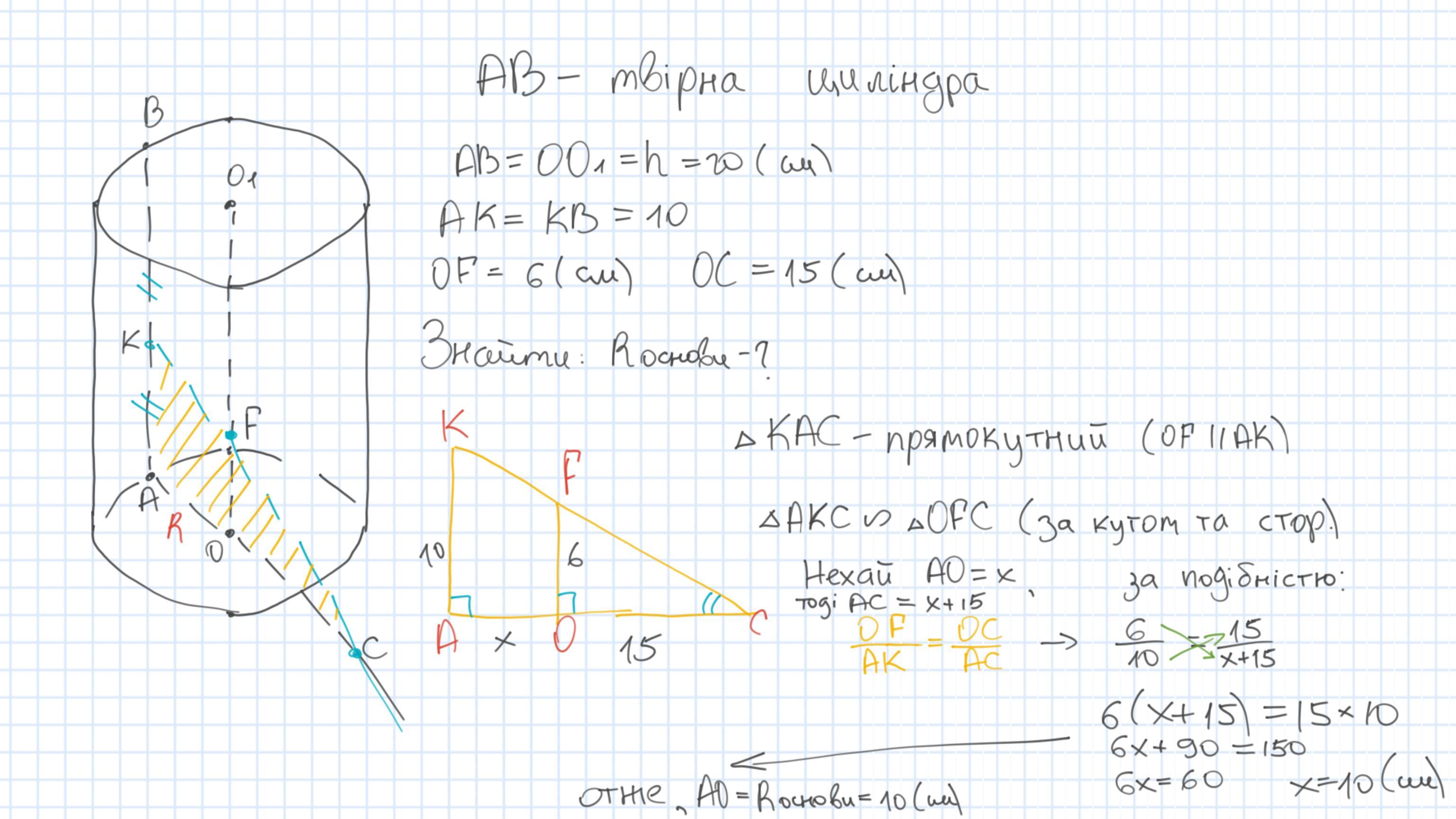 Висота циліндра дорівнює 20 см. Через середину твірної циліндра проведено пряму, яка перетинає відрізок, що сполучає центри основ, у точці, віддаленій на 6 см від площини нижньої основи, а саму цю площину - у точці, віддаленій на 15 см від центра нижньої основи. Знайти радіус основи циліндра