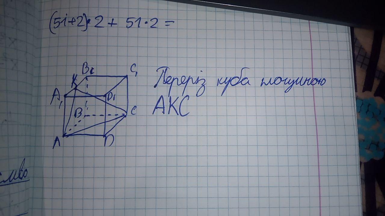 Побудувати переріз куба ABCDA1B1C1D1 площиною, яка проходить через вершини A, C і точку K, взяту на ребрі A1B1 . Встановити види перерізу.