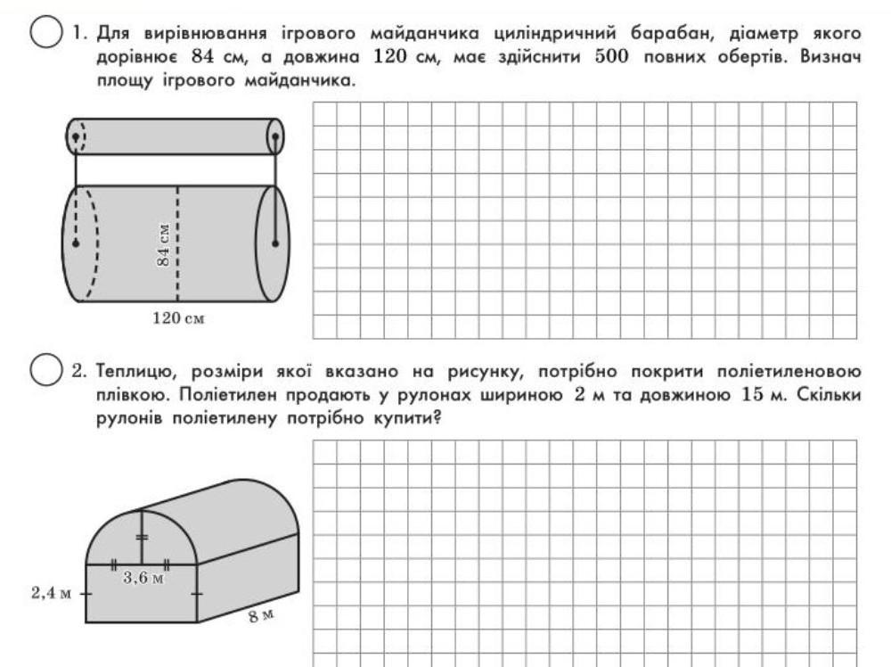 1. Для вирівнювання ігрового майданчика циліндричний барабан, діаметр якого дорівнює 84 см, а довжина 120 см, мов здійснити 500 повних обертів. Визнач площу ігрового майданчика.