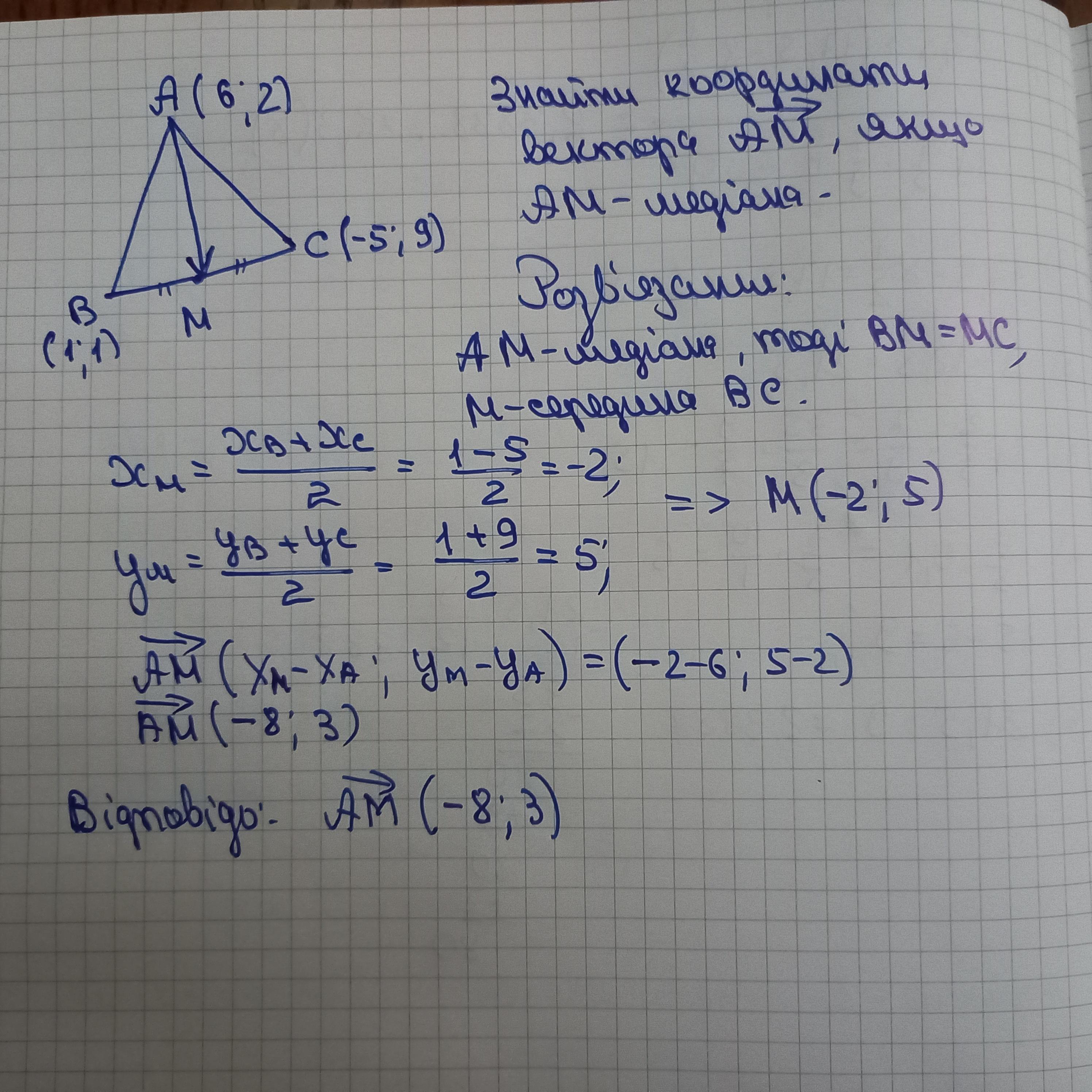 Відомі координати вершин трикутника АВС: А(6; 2), В(1; 1), С(–5; 9). Знайдіть координати вектора AM, якщо АМ – медіана цього трикутника.