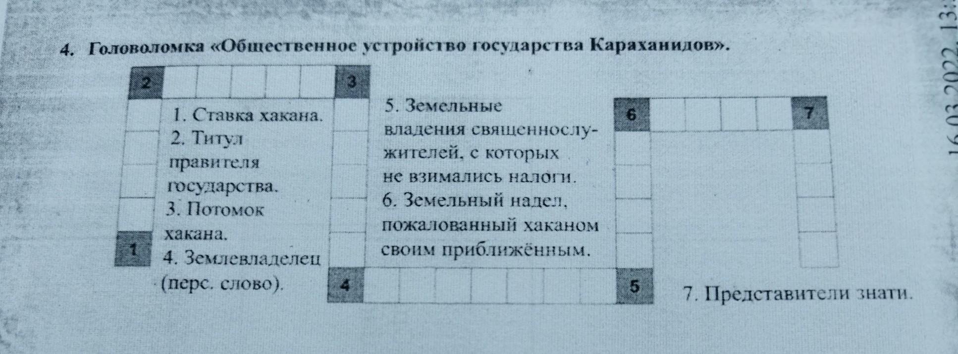 4. Головоломка «Общественное устройство государства Караханидов». 1. Ставка хакана. 2. Титул правителя государства. 3. Потомок хакана. 4. Землевладелец (перс. слово). 5. Земельные владения священнослу- жителей, с которых не взимались налоги. 6. Земельный надел, пожалованный хаканом своим приближённым. 5 7. Представители знати. 16.03.2022, 1 И ших кже И. И. ов зе к, в емли ельн ком и. IM