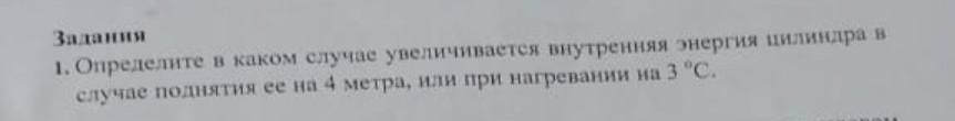 Определите, в каком случае увеличивается внутренняя энергия цилиндра в случае поднятия её на 4 метра, или при нагревании на 3°C.