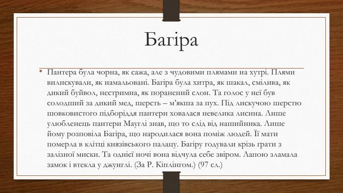 «… Багіра, чорна пантера, вся чорна, як чорнило, але з плямами, видними як водяні клейма при певному освітленні. Всі знали Багиру і всі боялися ставати їй поперек дороги, бо вона була хитра, … мужня, … нестримна... Її голос звучав м'яко, … а її шерсть була ніжнішою за лебединий пух».