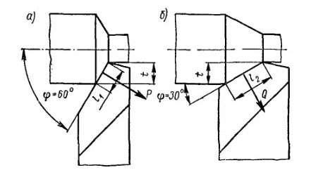 Значення головного кута в плані ф випливає з співставлень на яких схематично показані умови роботи різців при однакових подач s і глибині різання t, але при різних значеннях головного кута в плані.
