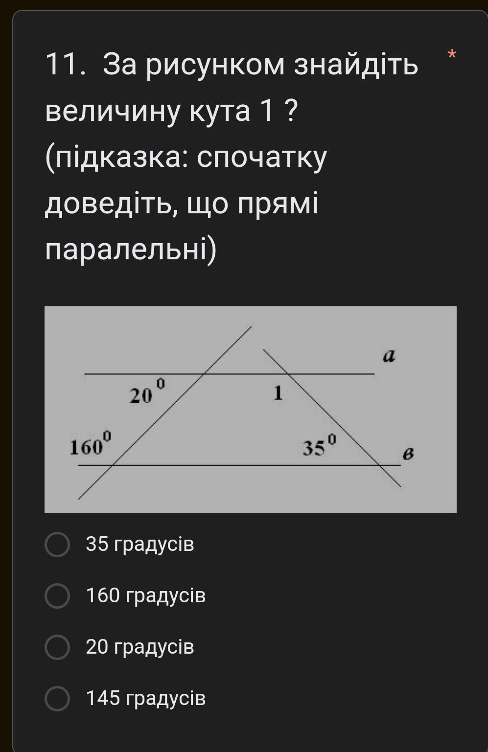 Оскільки сума внутрішні односторонніх кутів дорівнює 180°(160+20), прямі a і b є паралельні. Отже кут 1 дорівнює 180°-35°=145°, бо він є внутрішнім одностороннім з кутом градусна міра якого 35°.