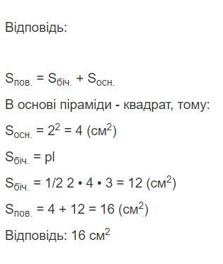 пжпжжпжпжп Сторона основи правильноï чотирикутної піраміди дорівнює 2 см, а апофема - 3 см. Знайдіть площу повной поверхні піраміди.