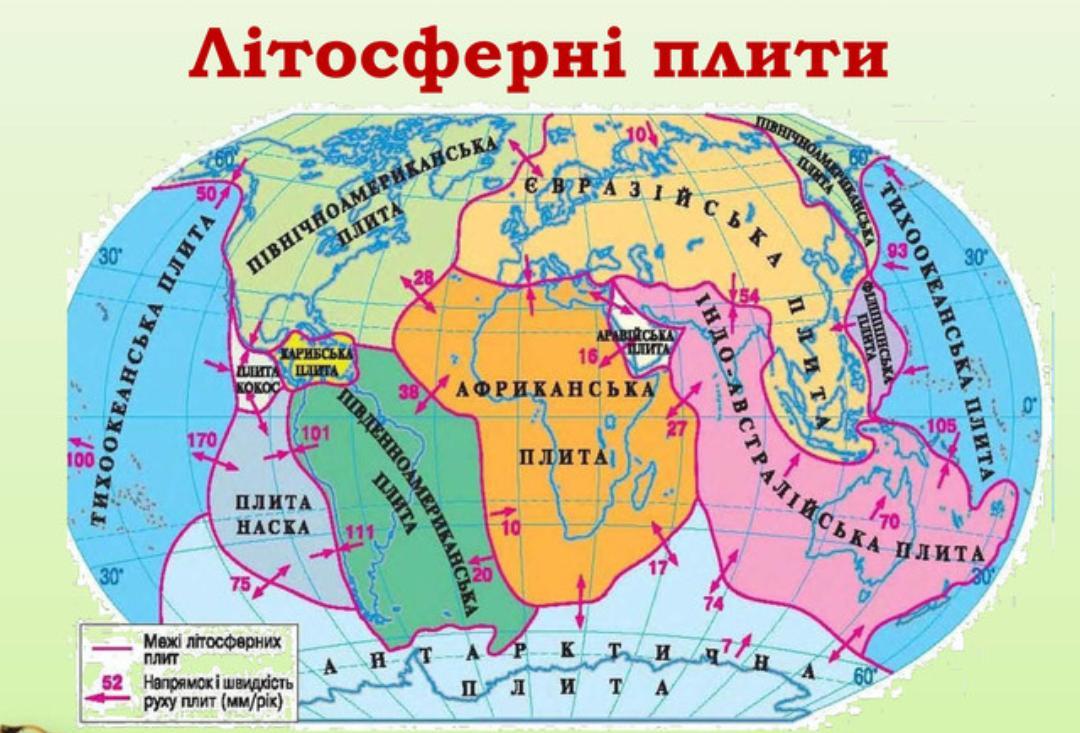 Літосферні плити рухаються по рухомому і пластичному слою верхньої мантії зі швидкістю кілька сантиметрів на рік.