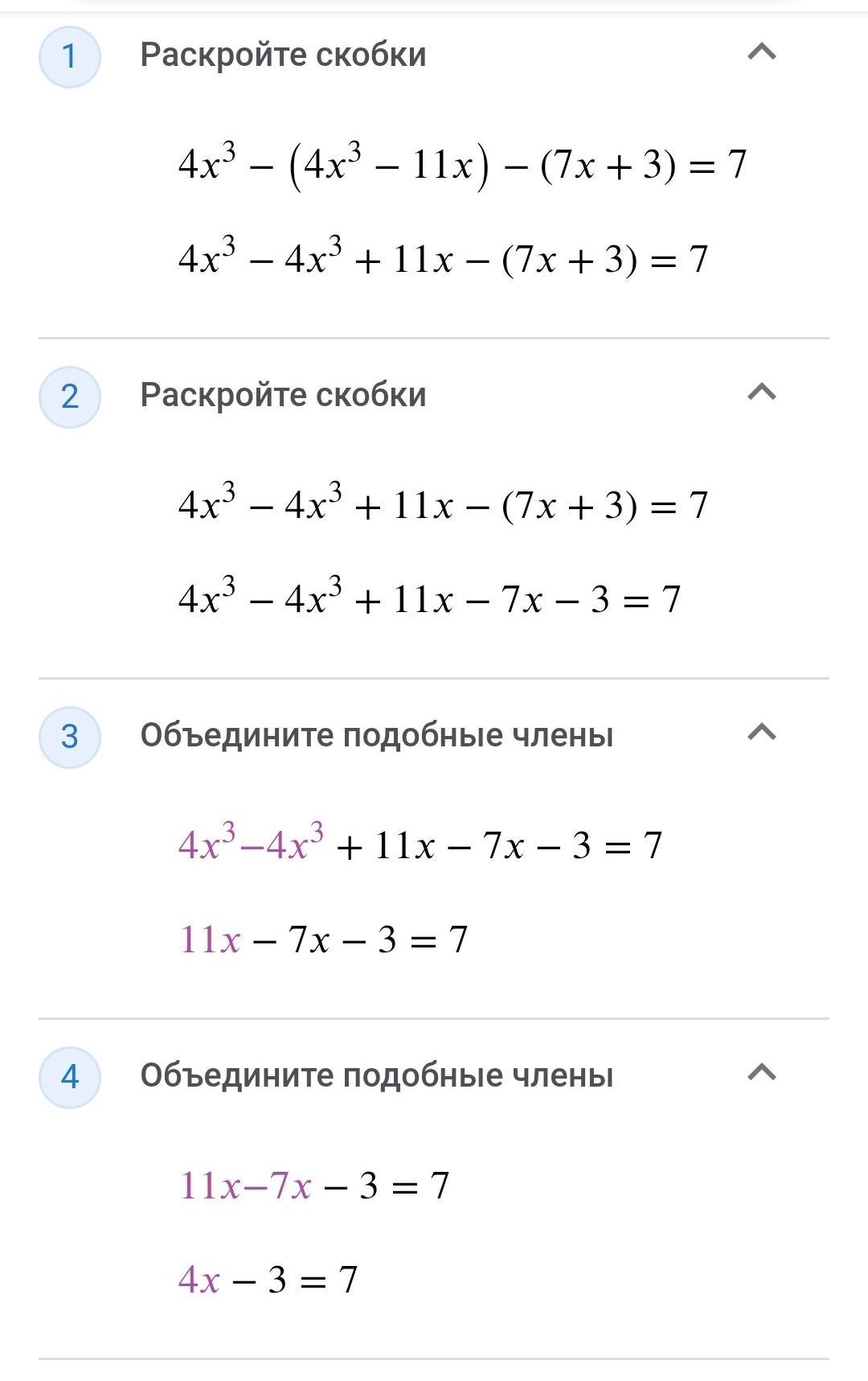 4x^3 - 4x^3 + 11x - 7x - 3= 7; 4x-3=7; 4x=10; x= 10 : 4; x= 5/2