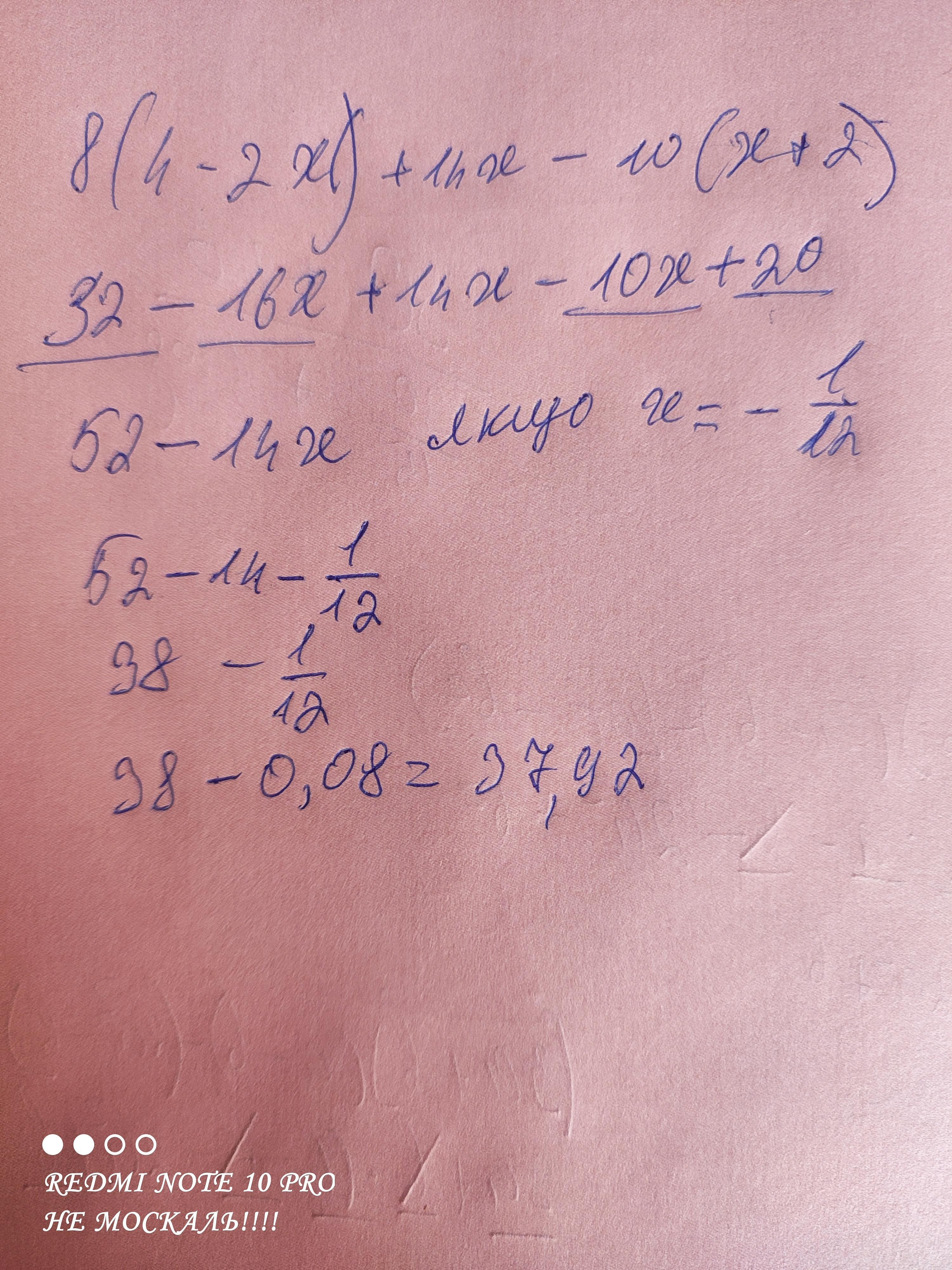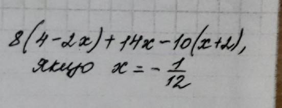 спростіть вираз і знайдіть його значення: 8(4-2x)+14x-10(x+2),якщо х=-1/12 СРОЧНОООО!