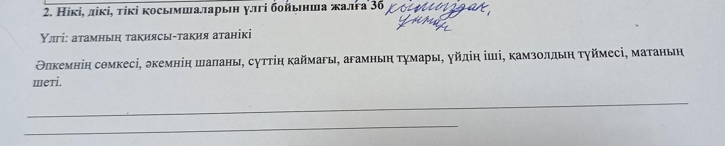 2. Нiкi, дiкi, тiкi косымшаларын улгi бойынша жалга Улгi: атамнын такиясы-такия атанiкi Әпкемнiн сөмкесi, әкемнiн шапаны, суттiн каймағы, агамнын тумары, уйдiн iшi, камзолдын туймесi, матанын шеті. помогите пж дам 21 балл