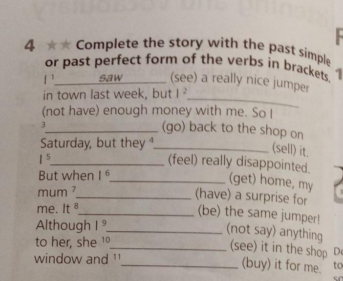 4* Complete the story with the past simple or past perfect form of the verbs in brackets. (see) a really nice jumper saw in town last week, but 12_ (not have) enough money with me. So I (go) back to the shop on (sell) it. 3 Saturday, but they 4 15 But when 16 7 mum me. It 8 Although 19 to her, she 10 window and 11 (feel) really disappointed. (get) home, my K 1 (have) a surprise for (be) the same jumper! (not say) anything (see) it in the shop Do (buy) it for me.