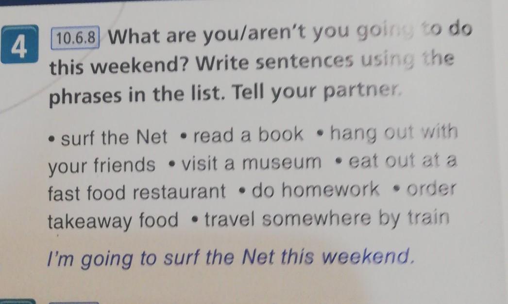 1. I am going to read a book this weekend. 2. I am going to go out with my friends this weekend 3. I am going to do my homework this weekend. 4. I am going to travel by train this weekend.