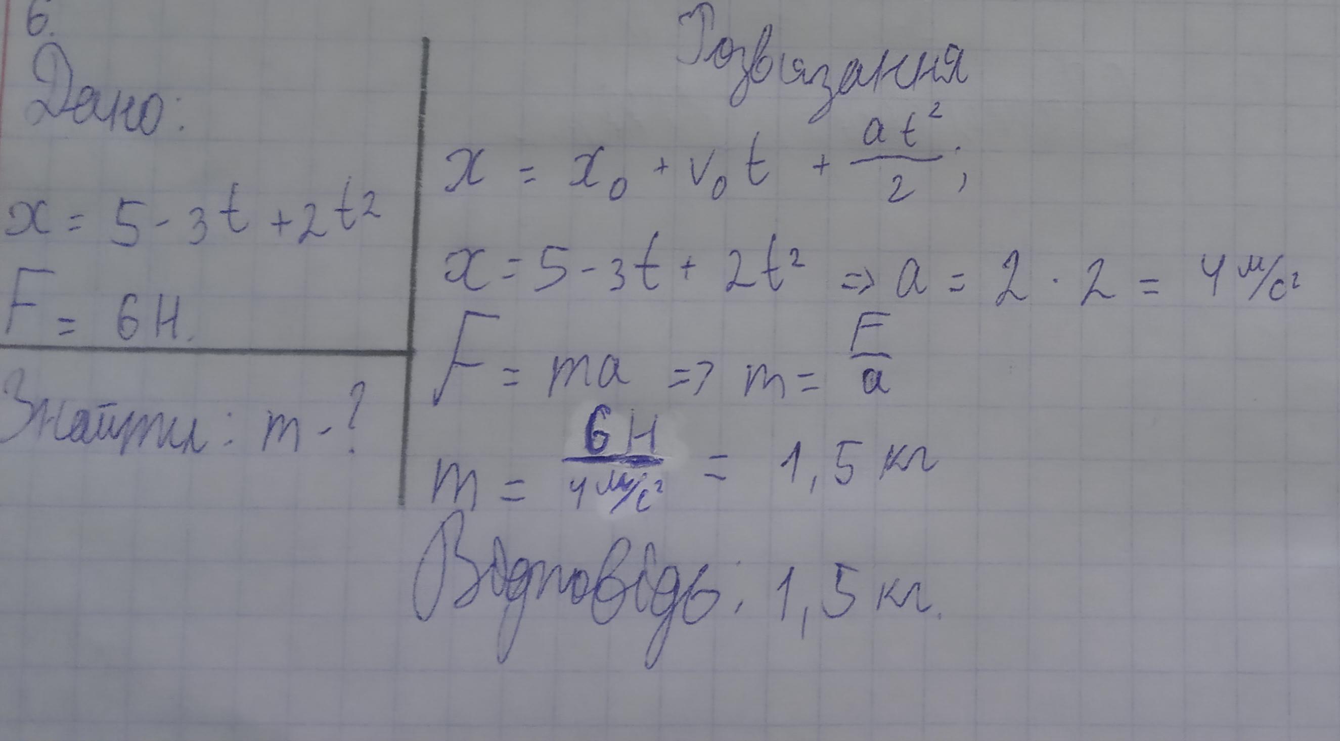 Координата тiла змінюється за законом x = 5 - 3t + 2t ^ 2 під дією сили 6 Н. Визначте масу тіла.