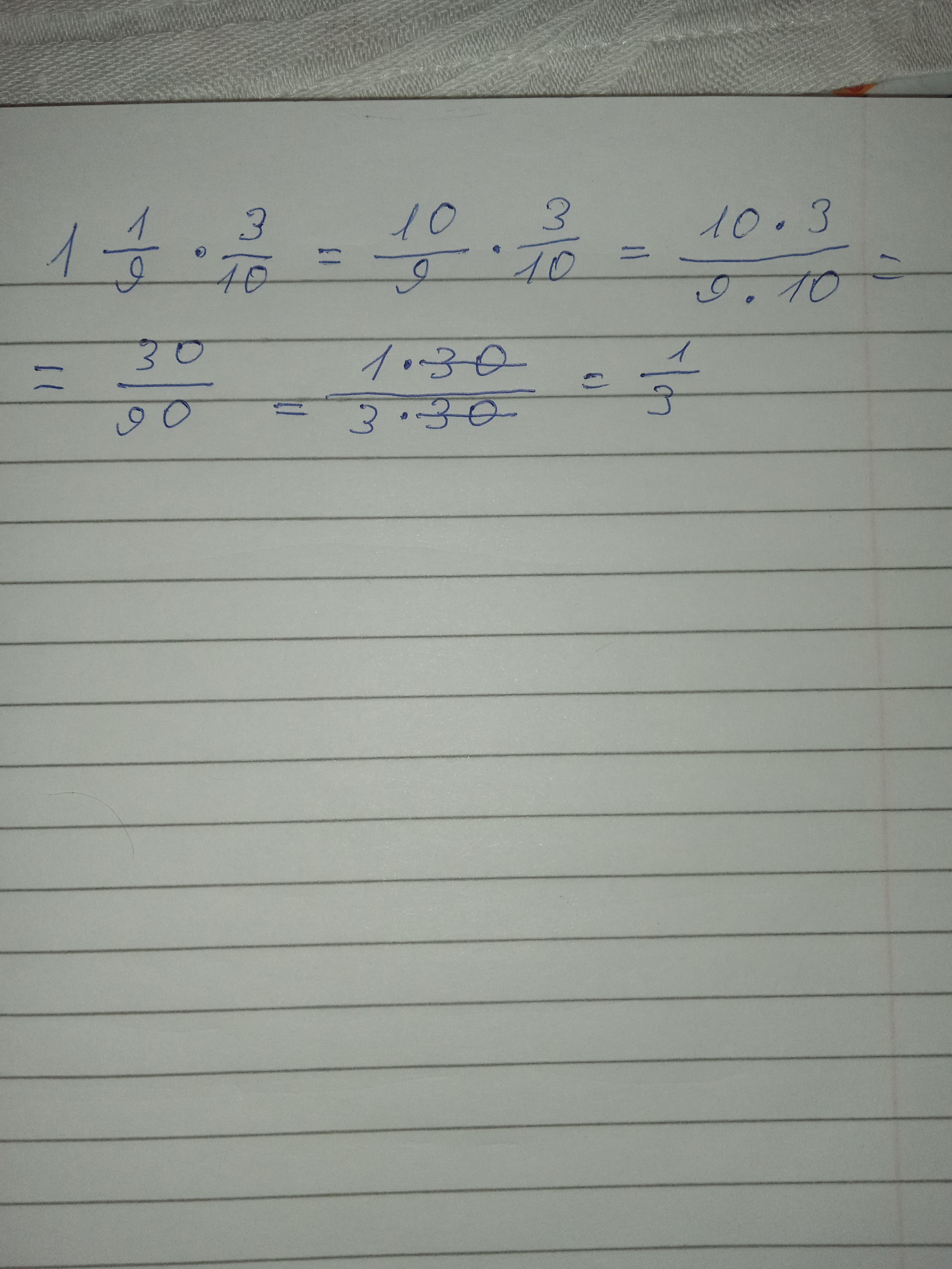 1 1/9 × 3/10 = 10/9 × 3/10 = 10×3/9×10= 30/90= 1×30(30 зачеркываем легко)/3×30(30 зачеркываем легко) = 1/3