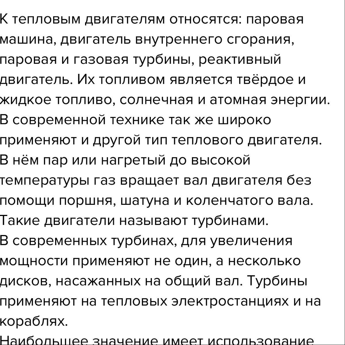 3. Тепловой двигатель в котором пар или нагреты до высокой температуры газ вращает вал двигателя без помощи поршня шатуна и коленчатого вала, получил название турбины их использования по сравнению с другими тёплыми двигателями более экономично и выгодно применяемые в турбинах водяной пар можно получить с помощью относительно недорогого топлива.