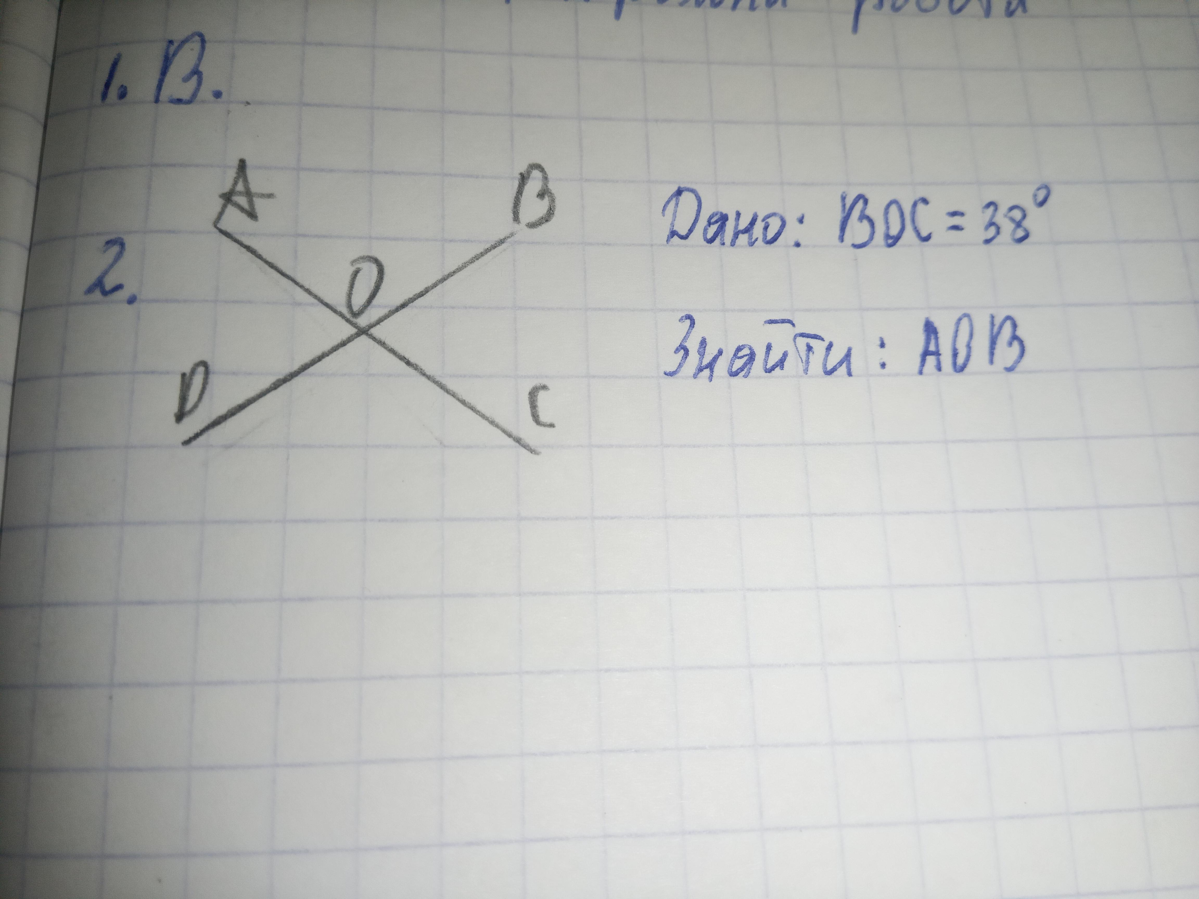 BOC=38⁰ тогда АОD тоже будет равен 38⁰ так как эти углы вертикальны