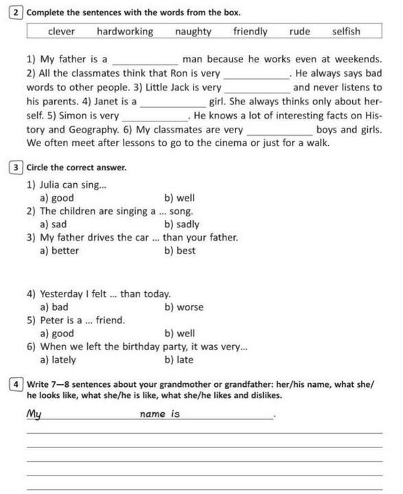 3. My grandmas name is lubov. I really love her. She is really short and has a short hair. She can’t see good but she never wears glasses. I don’t have any grandfathers and my grandmother doesn’t like when I talk about them. My granny loves when I visit her. By the way she really loves to cook, and she can do it really well. But the doesn’t enjoy playing chess and high prices at shops