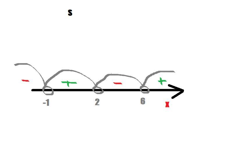 х ∈ ( -1;2) u (6; +∞)