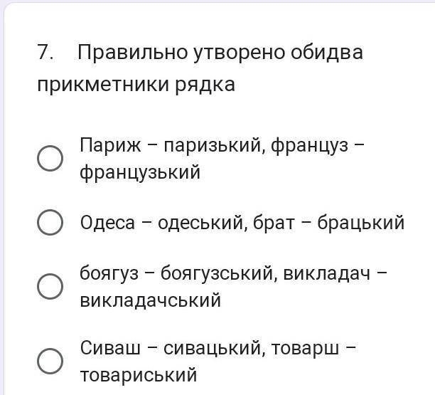 7. Правильно утворено обидва прикметники рядка Париж - паризький, француз - французький о – O Одеса - одеський, брат – - брацький боягуз - боягузський, викладач викладачський Сиваш - сивацький, товарш товариський Срочно дам 50 балов