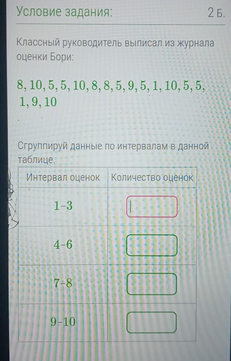 Условие задания: Классный руководитель выписал из журнала оценки Бори: 8, 10, 5, 5, 10, 8, 8, 5, 9, 5, 1, 10, 5, 5, 1,9, 10