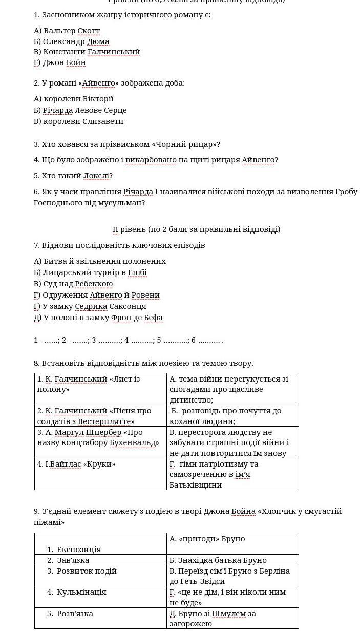 1. Засновником жанру історичного роману е: А) Вальтер Скотт Б) Олександр Дюма В) Константи Галчинський Г) Джон Бойн 2. У романі «Айвенго» зображена доба: А) королеви Вікторії Б) Річарда левове Серце в) королеви Єлизавети 3. Хто ховався за прізвиськом «Чорний рицар»? 4. Що було зображено і викарбовано на щиті рицаря Айвенго? 5. Хто такий Локслi? 6. Як у часи правління Річарда I називалися військові походи за визволення Гробу Господнього вiд мусульман? ІІ рiвень (по 2 бали за правильні відповіді) 7. Віднови послідовність ключових епізодів А) Битва й звiльнення полонених Б) Лицарський турнір в Ешбi В) Суд над Ребеккою Г) ОДРУЖЕННЯ Айвенго й Ровени 1) у замку Седрика Саксонця Д) у полоні в замку Фрон де Бефа 1; 2; 3; 4-...; 5-...........; 6-........... 8. Встановіть вiдповiднiсть мiж поезією та темою твору. 1. К. Галчинський «Лист із полону» 2. К. Галчинський «Пісня про солдатів з Вестерплятте>> 3. А. Маргул-Шпербер «Про назву концтабору Бухенвальд 4. 1.Вайґлас «Круки>> 1. Експозиція 2. Зав'язка 3. Розвиток подій 4. Кульмінація 5. Розв'язка А. тема вiйни перегукується зі спогадами про щасливе Дитинство; Б. розповідь про почуття до коханої людини; 9. З'єднай елемент сюжету з подією в творі Джона Бойна «Хлопчик у смугастій піжамi> В. пересторога людству не забувати страшні події війни і не дати повторитися їм знову г. гімн патріотизму та самозреченню в ім'я Батьківщини А. > Бруно Б. Знахідка батька Бруно В. Переїзд сім'ї Бруно з Берліна до Геть-Звідси Г. «це не дiм, і він ніколи ним не буде>> Д. Бруно зі Шмулем за загорожею.Срочно нужно пж!!Дам бали!!