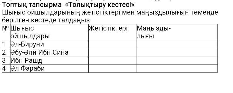 Топтық тапсырма.Шығыс ойшылдарының жетістіктері мен маңыздылығын төменде берілген кестеде талдаңыз