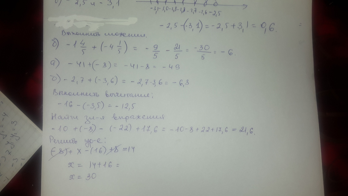 Найти с помощью координатной прямой сумму чисел а) -3 и 8 б)-2,5 и -3,1- б)-1 4/5+(-4 1/5) Выполнить сложение:а) -41+(-8)б)-2,7+(-3,6) Выполнить вычитание-16-(-3,5) Найти значение выражения:-10+(-8)-(-22)+17,6 Решить уравнение:(-8)+х-(16)+8=14 Решить уравнение:/1-х/=8 /2-х/=6