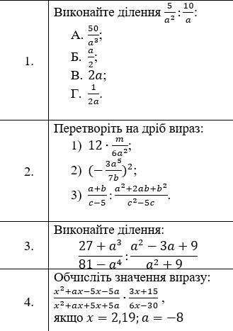 1. 5/a²:10/a=5/a²*a/10=1/2a Г.