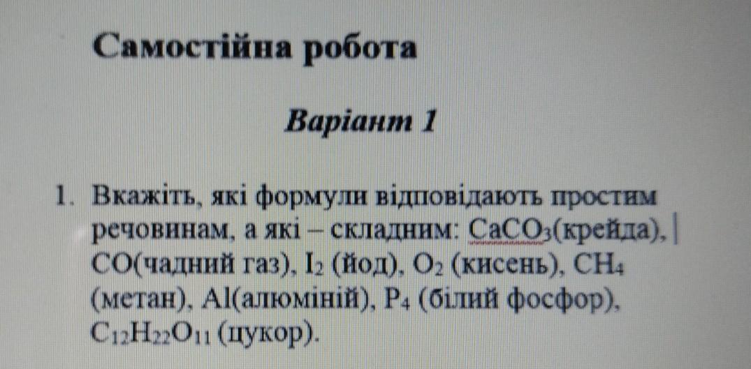 Вкажіть, якi формули відповідають простим речовинам, а якi - складним: СаСО3(крейда), СО чадний газ). 12 (йод). Од (кисень). СН (метан). Ак(ал омiнiй). Р. (білий фосфор). Сон (цукор).