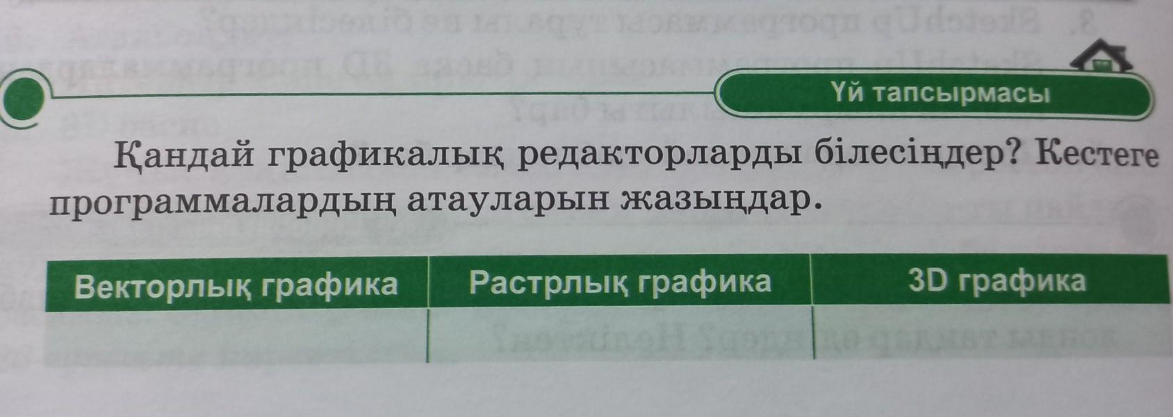 Уй тапсырмасы Кандай графикалык редакторларды бiлесiндер? Кестеге программалардын атауларын жазыңдар.
