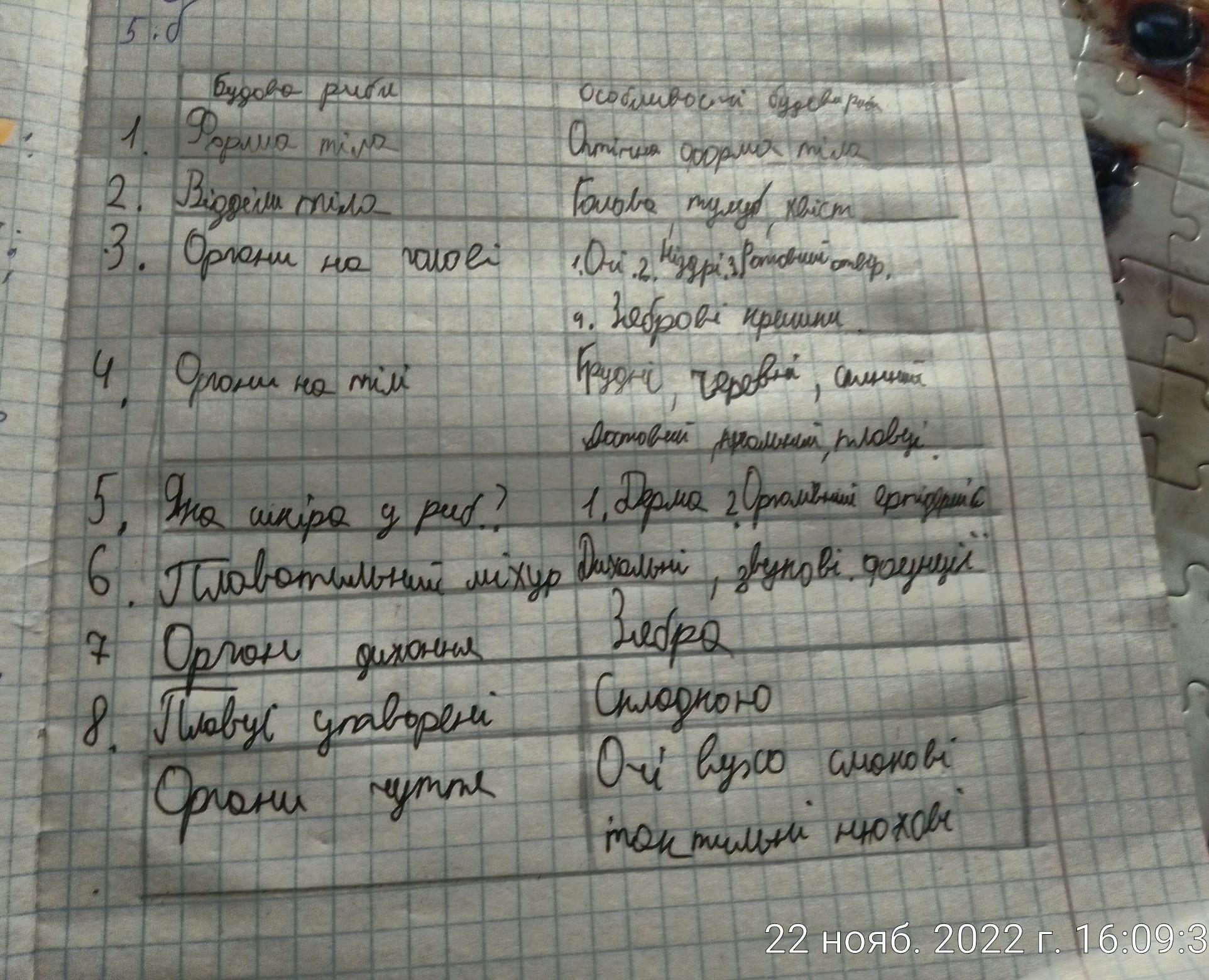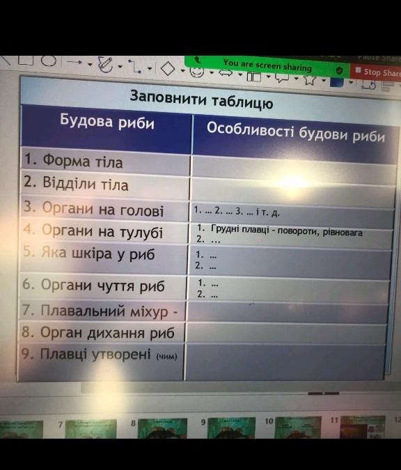 Заповнити таблицю Будова риби 1. Форма тіла 2. Вiддiли тіла 3. Органи на голові 4. Органи на тулубі 5. Яка шкіра у риб 6. Органи чуття риб 7. Плавальний міхур - 8. Орган дихання риб 9. Плавці утворені (чим) 1.... 2... 3. ...i T. A. 1. Груднi плавці-повороти, рівновага 2. 1. 2. Особливості будови риби 1. 2. ... *** www 1 www
