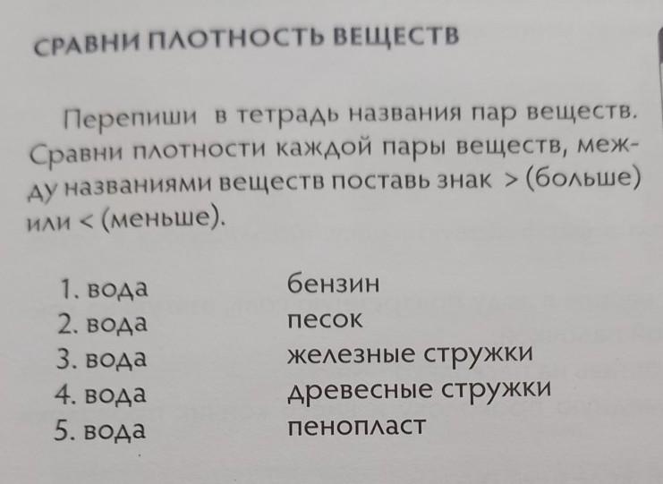 СРАВНИ ПЛОТНОСТЬ ВЕЩЕСТВ Перепиши в тетрадь названия пар веществ. Сравни плотности каждой пары веществ, меж- ду названиями веществ поставь знак > (больше) или < (меньше). 1. вода 2. вода 3. вода 4. вода 5. вода бензин песок железные стружки древесные стружки пенопласт