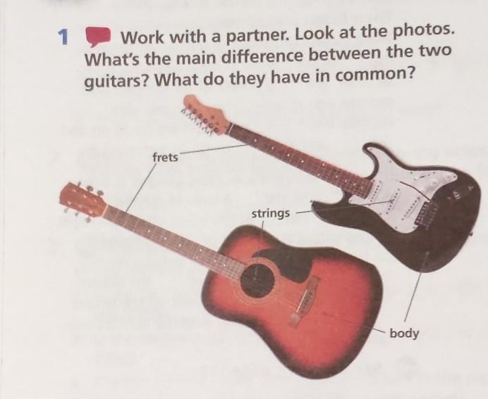Work with a partner. Look at the photos. What's the main difference between the two guitars? What do they have in common? frets strings ...... ******** ESESLER body 2009