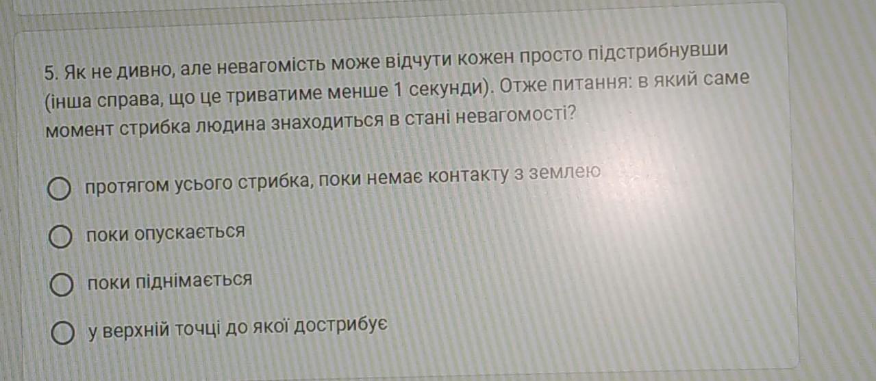 Пояснення: Якби не було під час руху опору повітря, то у невагомості людина знаходилася протягом усього стрибка, поки немає контакту з землею. Якщо автор тесту нехтує опором повітря, то для нього буде правильною відповіддю 1.